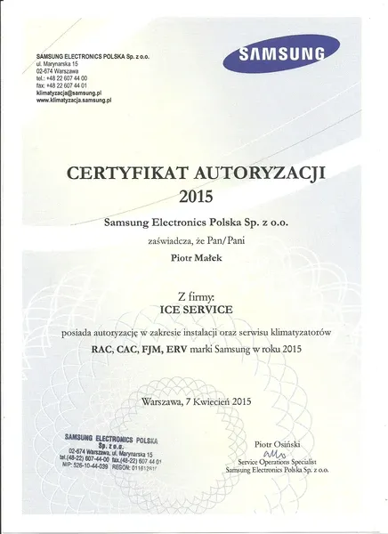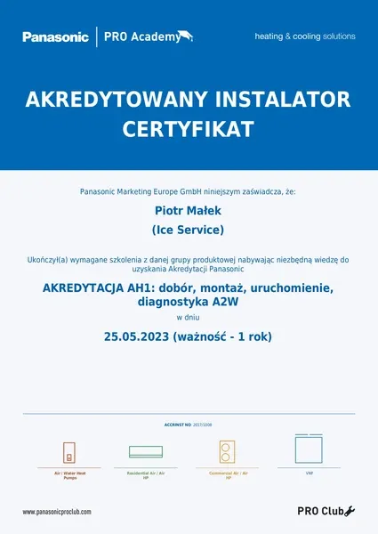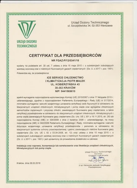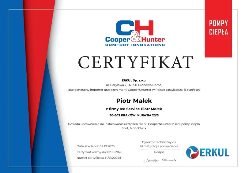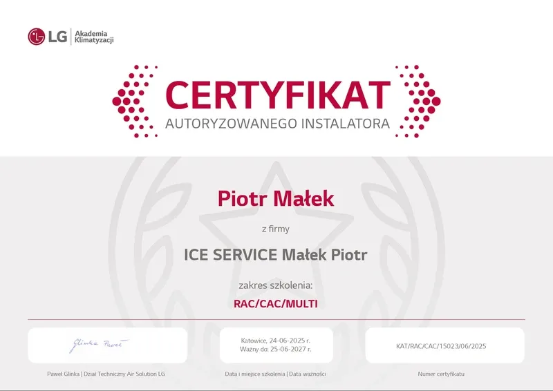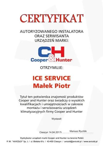 Ice Service posiada certyfikaty i uprawnienia potwierdzające najwyższą jakość świadczonych usług. Dzięki autoryzacjom renomowanych producentów klimatyzacji i pomp ciepła gwarantujemy rzetelny montaż, serwis oraz doradztwo techniczne zgodne z obowiązującymi normami.